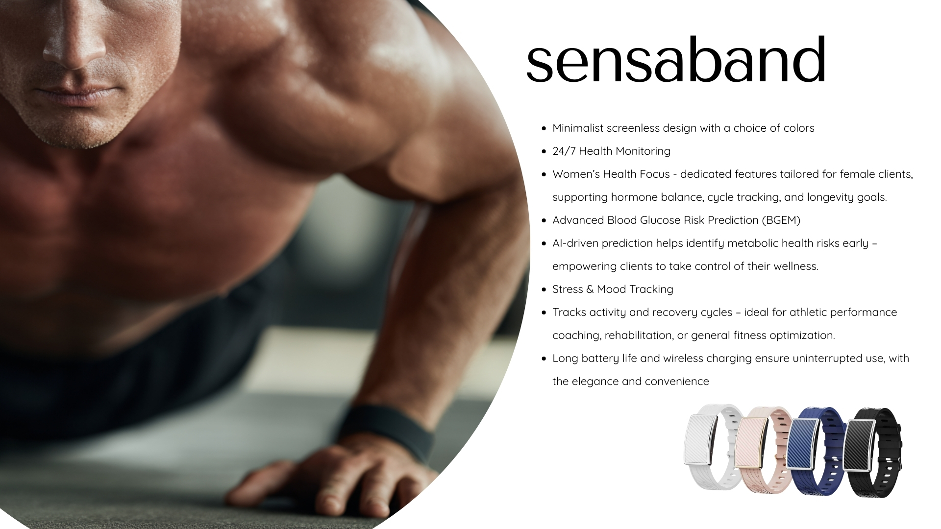 Compact wellness band with 24/7 HR, SpO2, temp, HRV, and step count.
