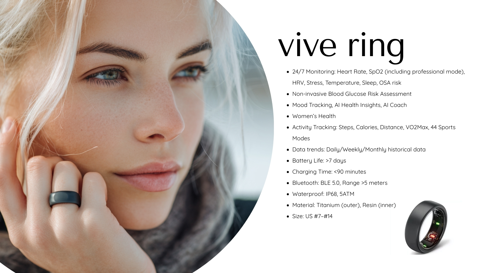 Titanium smart ring with SpO2, HRV, glucose risk, and AI coaching.